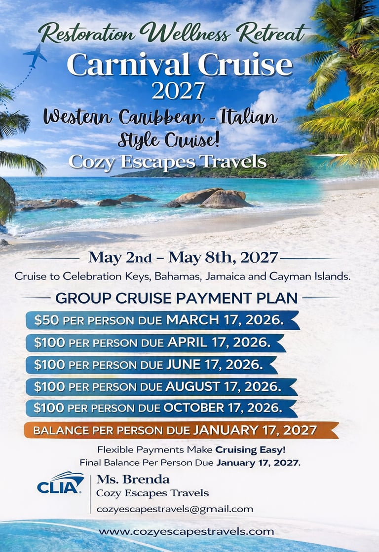In May 2027, we are setting sail for our Restoration Wellness Retreat at Sea aboard Carnival Cruise Line.